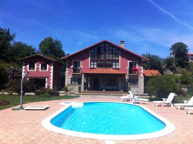 Casa principal con planta baja: porche,recibidor,aseo,habitacion doble con baño,salón con chimenea,cocina.Primera planta: salón,dos habitaciones con baño.Segunda planta:habitación principal con baño. Casa de invitados con tres habitaciones,garaje y bodega. Piscina climatizada de 10X5 M. Finca cerrada de 2500 m2. con vistas a los Picos de Europa.